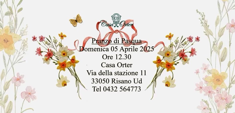via stazione 11, 33050 Risano via stazione 11, 33050 Risano, ItalyPranzo di PasquaDomenica 05 Aprile 2025Ore 12.30Casa OrterVia della stazione 1133050 Risano UdTel 0432 564773Menu’ -Piccolo Aperitivo di Benvenuto*-L’asparago del Fossalon, salsa di zabaglione salato e croccante di pancetta di Sauris*-I ravioli di casa...