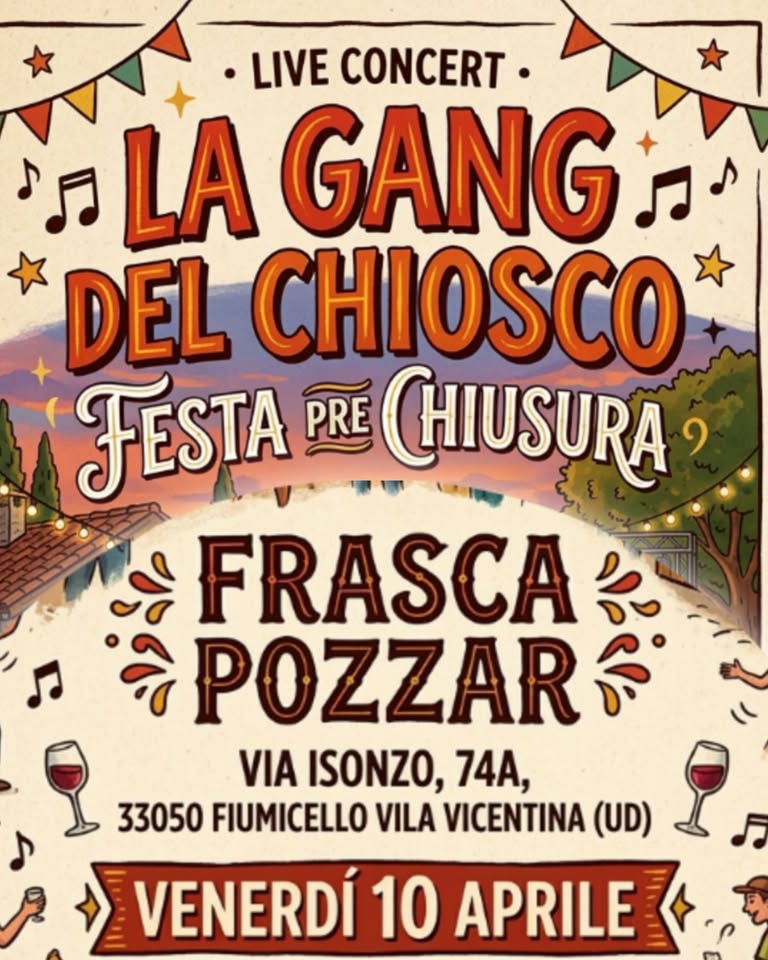 21 eventi, - ![]() Lunedì 6 aprile 2026Quest’anno Pasquetta è ancora più speciale: festeggiamo 10 anni insieme 🌿Il parco si trasforma in una grande festa tra animazioni, giochi, cacce al tesoro, spettacoli, cestinin da picnic ovunque e momenti... - ![]() 🔥 PASQUETTA MUSIC FEST 2026 🔥LA PASQUETTA PIÙ PAZZA DEL FRIULI📅 Lunedì 6 Aprile – dalle ore 11:00📍 Corte della Fenice (ex Fienile)Via Buttrio 4 – Orzano (UD)Dopo il delirio dello scorso anno…torna l’evento... - ![]() 📌 LUNEDÌ 6 APRILE – PASQUETTA GRADESE 🍹Manca esattamente un mese alla pasquetta 2026 e Isola d’Oro è pronta a dare il via alla stagione estiva come si deve! ☀️🌴La tradizione continua e tornano... | 0 eventi, | 0 eventi, | 3 eventi, - ![]() https://pnssm.pro/9wifnitE se ti dicessi che al Melograno Tavagnacco il 9 aprile puoi cenare, divertirti, fare nuovi amici e parlare in inglese? Ti aspettiamo! Let's have dinner in English! - ![]() 🔥 ZU live @ ASTRO CLUB 🔥📅 Giovedì 09 aprile 2026📍 Fontanafredda (PN)Una delle band più radicali e influenti della musica underground europea torna dal vivo ad Astro.Nati a Ostia nel 1997, Zu hanno... - ![]() Monologo in 4 quadri di e con Christian Colombera - regia di Marina De Carli, con la partecipazione del Coro Coneglianorassegna "Il Porto del Teatro"BIGLIETTERIA DEL TEATRO APERTA DALLE ORE 18 DEL 9 APRILE | 9 eventi,![]() Ti invitiamo Venerdì 10, Sabato 11 e Domenica 12 Aprile alla 27^ Edizione di ⭑ UN BIEL VIVI ⭑ per celebrare insieme a noi i sapori, le tradizioni e lo spirito delle Pro Loco... - ![]() Come ogni anno ad aprile Frasca Pozzar chiude a Fiumicello per migrare ai Talponi aPieris! Quest'anno però si chiude in bellezza!💥 Venerdì 10 aprile festazza con la Gang del Chiosco dalle 18.30 e tutto... - ![]() Vi aspettiamo numerosi!!!!!!!!!Fiumi di birra e panini gustosissimi con la nostra super cuoca Fiorella🍺🍻🍔🥪🥳🎊 - ![]() English and Romanian below:Tre band, due metal-core, due alternative-metal, due con voci femminili e una costante nel massiccio impatto sonoro.UNDERWAVESProvenienti dalla Romania, nella prima e unica tappa italiana del loro tour europeo che li... | 13 eventi,![]() 🗓️ Sabato 11 aprile 2026⛓️ RAZOR ⛓️ atto quartoThe Hardcore and Hardtechno Night⚡️Torna anche ad aprile per l’ultimo appuntamento della stagione la notte dedicata ai suoni più hard! In collaborazione con GABBERTIME e ØNATION2... - ![]() 🕰️𝑻𝒆𝒎𝒑𝒐 𝒂𝒍 𝑻𝒆𝒎𝒑𝒐 𝒆̀... 𝒈𝒂𝒔𝒕𝒓𝒐𝒏𝒐𝒎𝒊𝒂 𝒆 𝒕𝒆𝒓𝒓𝒊𝒕𝒐𝒓𝒊𝒐🧀 𝗦𝗮𝗹𝗮𝘁 T𝗿𝗮𝗺𝘂𝗻𝘁𝗶𝗻 | 𝑑𝑒𝑔𝑢𝑠𝑡𝑎𝑧𝑖𝑜𝑛𝑒 𝑑𝑖 𝑓𝑜𝑟𝑚𝑎𝑔𝑔𝑖 𝑑𝑖 𝑝𝑒𝑐𝑜𝑟𝑎 𝑑𝑒𝑖 Fʀᴀᴛᴇʟʟɪ Gᴀᴍʙᴏɴ (𝑇𝑟𝑎𝑚𝑜𝑛𝑡𝑖 𝑑𝑖 𝑆𝑜𝑝𝑟𝑎) 𝑐𝑜𝑛 𝑐𝑎𝑙𝑖𝑐𝑒 𝑑𝑖 𝑣𝑖𝑛𝑜 🥂🗓 Sabato 11 aprile 2026 | ore 18:00📍Osteria dei... - ![]() 11. april 2025 @Dvorana Gustaf Pekarna, MariborVrata: 19:30 / Koncert: 20:00UNDERWAVESUnderwaves je romunska metalcore skupina, ustanovljena leta 2017, ki ponuja edinstveno mešanico alternativnega metalcora in melodičnega deathcora. Skupina je znana po svojem prepoznavnem zvoku,... - ![]() Po več kot desetih letih se na oder vračajo 🔥SHUTDOWN🔥!Ponovno združeni člani bodo 11. aprila na Mostovni odigrali poseben koncert "The final Shutdown", v čast in v spomin prijatelju, večnemu glasu benda - Egziju.Za... | 10 eventi, - ![]() Ritorna l'appuntamento annuale con la Festa di Primavera a Gonars!Dalle ore 9:00 per le vie del paese: attività commerciali aperte, mercato ambulanti, stand KM0, hobbisti, stand informativi, street-food e fornitissimi chioschi aperti. - ![]() La mattina può essere molto più di quello che ti hanno sempre raccontato.Dopo il successo della data zero torna il Morning Club di Creativa: Domenica 12 Aprile dalle 10.00 alle 15.00, Home Viale apre... - ![]() ☀️ DOMENICA IN BRUNCHDomenica 12 Aprile al Bar Sport di Aiello arriva un nuovo modo di vivere la domenica.Un mix perfetto di brunch, cocktail e musica per iniziare la giornata con gusto e leggerezza.🎧... |